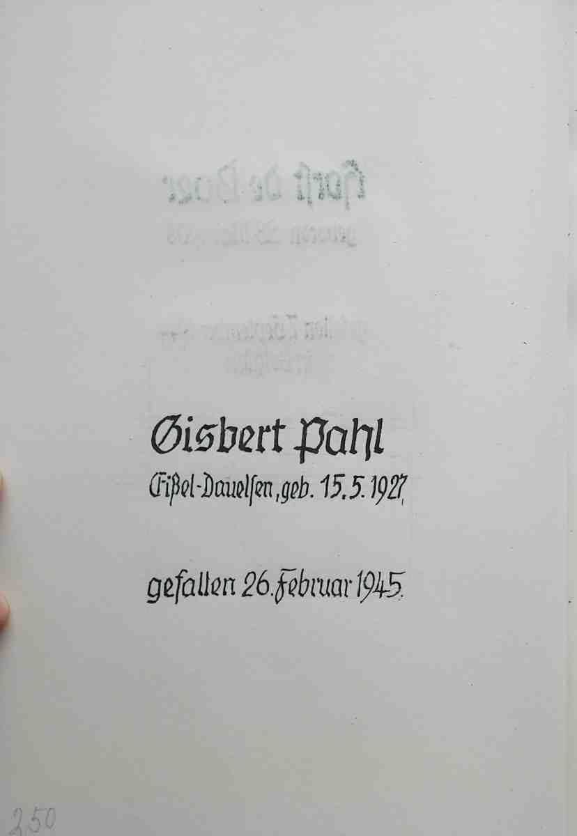 Volksbund Gräbersuche: Dienstgrad: Grenadier Geburtsdatum: 15.05.1927 Geburtsort: Sossnow Todes-/Vermisstendatum: 02.02.1945 Todes-/Vermisstenort: am Gran Brückenkopf/Ungarn Gisbert Pahl konnte im Rahmen unserer Umbettungsarbeiten nicht geborgen werden. Die vorgesehene Überführung zum Sammelfriedhof in Budaörs - Sammelfriedhof (Ungarn) war somit leider nicht möglich. Sein Name wird im Gedenkbuch des Friedhofes verzeichnet.